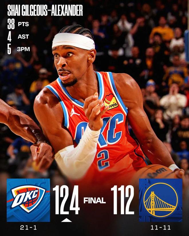 常规赛,雷霆客场124-112战胜勇士。