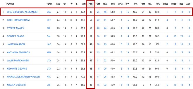 ——总得分87分的亚历山大只打了10场关键时刻比赛,第二的坎宁安打了13场,总得分67分,多打3场还与亚历山大相差了整整20分;