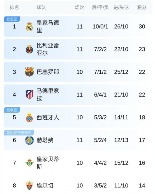 西甲联赛最新积分榜如下: