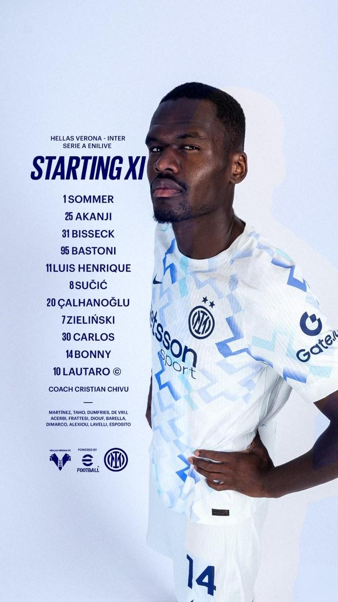 国际米兰首发:1-索默、25-阿坎吉、31-比塞克、95-巴斯托尼、11-路易斯-恩里克、8-苏契奇、20-恰尔汗奥卢、7-泽林斯基、30-卡洛斯-奥古斯托、14-博尼、10-劳塔罗-马丁内斯